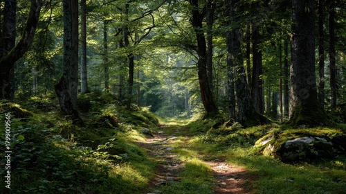 Fototapeta premium Peaceful forest path surrounded by tall trees and lush greenery in the early...