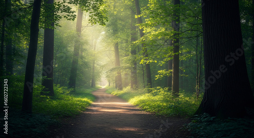 © hwsky, Naklejka premium Peaceful Forest Path with Sunbeams Symbolizing Hope and Healing. Serene Nature Trail for Reflection and Renewal.