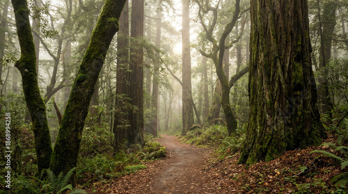 Obraz premium Peaceful forest pathway surrounded by tall trees with soft diffused light,...