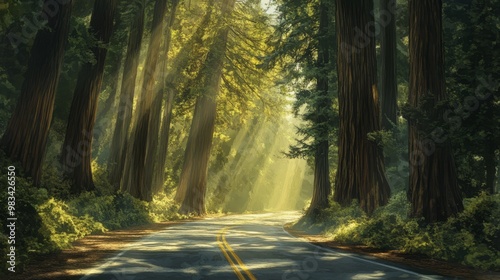© Damerfie, Obraz premium Peaceful Forest Road Surrounded by Majestic Trees
