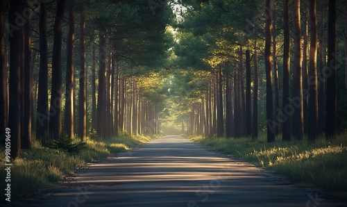 Fototapeta premium Peaceful Forest Road with Towering Pine Trees and Sunlight Filtering Through...