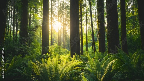 Naklejka premium Peaceful forest scene characterized by tall trees, a soft forest floor covered in lush ferns, and dappled sunlight filtering through the canopy. A serene and calming natural environment.