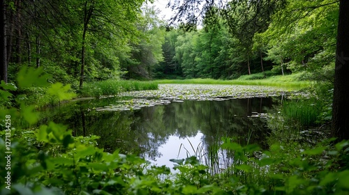 Fototapeta premium Peaceful forest scene with a calm pond surrounded by lush trees and greenery...