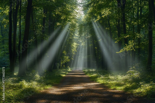© Dennis, Fototapeta premium Peaceful forest scene with sunlight rays filtering through the dense canopy of trees.