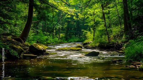 Obraz premium Peaceful Forest Stream with Mossy Rocks and Green Foliage