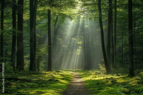 © Andrii Savchuk, Fototapeta premium Peaceful forest with sun rays illuminating the mossy ground