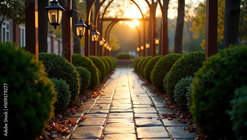 Fototapeta premium Peaceful Garden Pathway at Sunset with Lantern Decoration Surrounded by Trees...