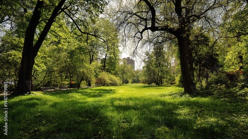 Fototapeta premium Peaceful Green Glade Surrounded by Tall Trees in Nature's Embrace