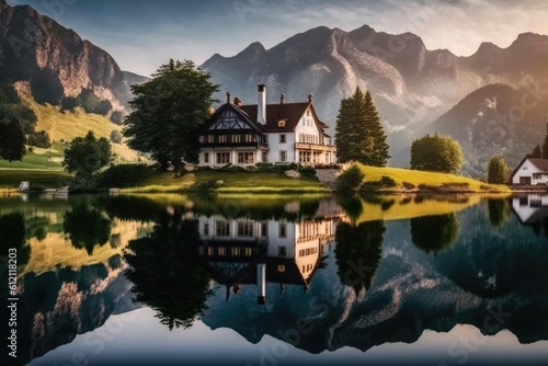Fototapeta premium peaceful house overlooking a green hillside and lake. Generative AI