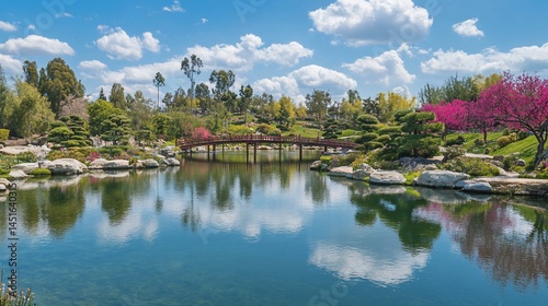 Fototapeta premium Peaceful Japanese garden with a serene pond and bridge