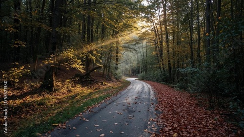 © Muhammad, Fototapeta premium Peaceful jogging track surrounded by forest trees with gentle sunlight and dry winter leaves on the path. Perfect for fitness and outdoor lifestyle concepts promoting healthy living