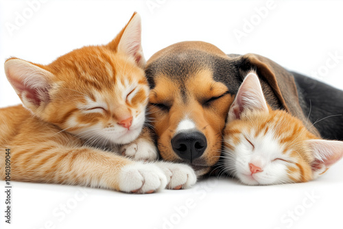 Fototapeta premium Peaceful Kittens and Puppy Sleeping Together on White Background