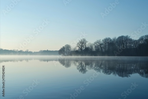 Fototapeta premium Peaceful lake at dawn with trees reflecting on calm water under a clear sky
