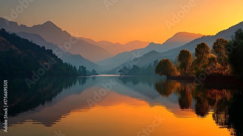 Fototapeta premium Peaceful lake at golden sunset with glowing reflection on calm water, minimal...