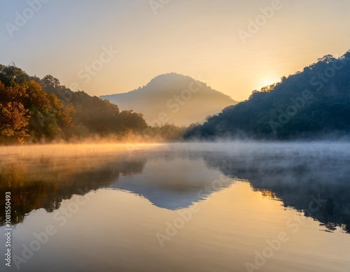 Fototapeta premium Peaceful Lake at Sunrise, With Mist Rising From the Water and a Lone Mountain Reflecting on the Calm Surface, Surrounded by Autumn Forests in Soft Morning Light
