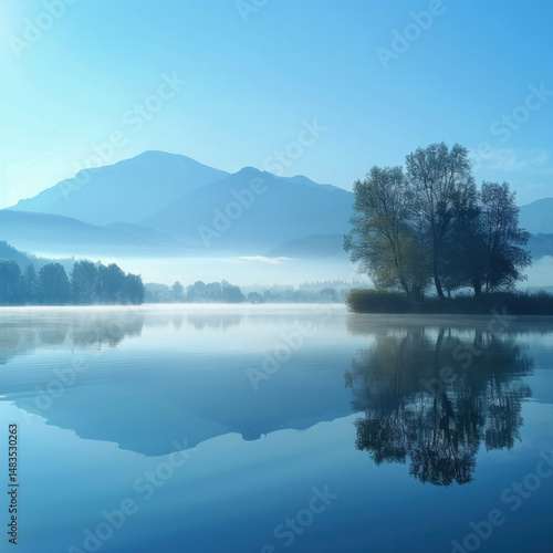 © Alleuy, Fototapeta premium Peaceful lake dawn reflection mountains