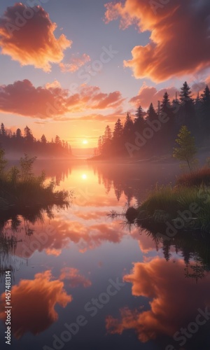 Obraz premium Peaceful lake mirroring a vibrant sunset, clouds softly glowing , calm, natural