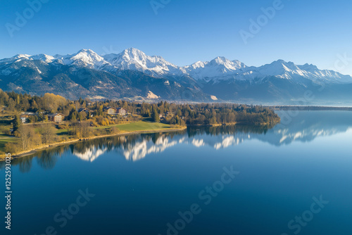 Obraz premium Peaceful lake surrounded by snow-capped mountains, offering a serene and...