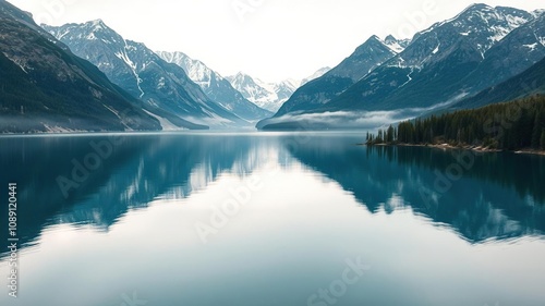 Fototapeta premium Peaceful lake with surrounding snow-capped mountains, serene scenery, frozen...