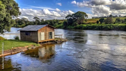 © tnihousestudio, Naklejka premium Peaceful lakeside boathouse reflecting on calm water under a cloudy sky.
