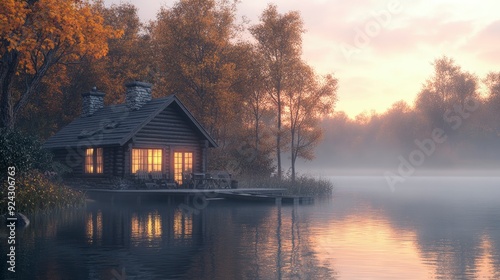 Fototapeta premium peaceful lakeside cabin at sunrise, with mist rising off the water, soft morning light, calm and serene tones