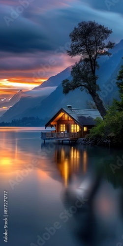 Fototapeta premium Peaceful lakeside cabin with mountains at sunset