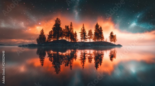 © ADD PHOTO, Fototapeta premium Peaceful Lakeside Forest Landscape at Sunset with Reflected Glow