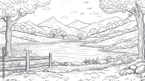 © ciblek224, Obraz premium Peaceful lakeside landscape drawing