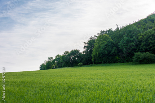 © kugelwolf, Obraz premium Peaceful landscape with green meadows.