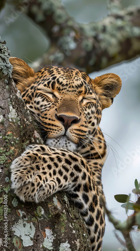© Maestro, Fototapeta premium Peaceful leopard sleeping in tree, African jungle
