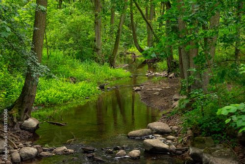 © bartheq, Fototapeta premium Peaceful little river flowing through a deciduous forest. Dense green vegetation and large stones in the water and on the bank.