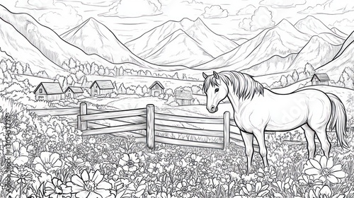 © lestari, Naklejka premium Peaceful meadow scene, horses, mountains. Suitable for coloring book or print