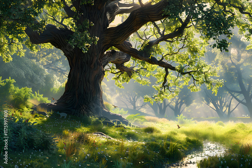 Fototapeta premium Peaceful Meadow with Majestic Oak Tree and Winding Brook, Highlighting...