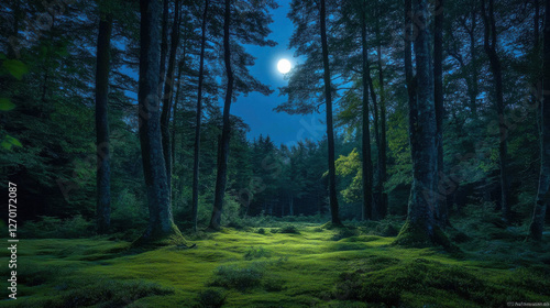 © Patwarin, Fototapeta premium peaceful moonlit glade surrounded by towering trees, creating serene atmosphere. soft glow of moon illuminates lush greenery