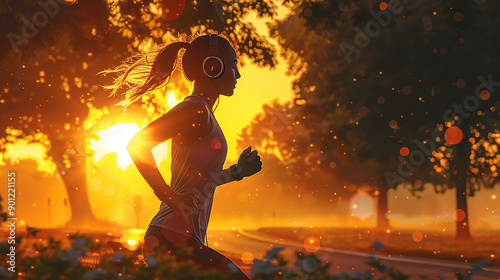 © Wanchai, Naklejka premium Peaceful Morning: A young woman with a serene smile, wireless headphones on, jogging along a tranquil lakeside path, the calm water reflecting the soft dawn sky.