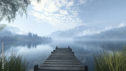 © Wicha1, Naklejka premium peaceful morning by the lake, with a wooden pier extending into calm waters and misty mountains in the distance.