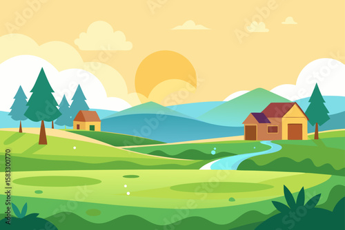 Obraz premium peaceful morning in village with dew covered fiel
