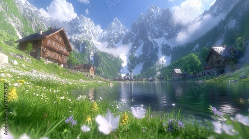 Fototapeta premium Peaceful mountain lake reflection alpine village nature scene serene...