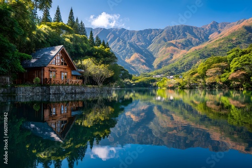 Fototapeta premium Peaceful Mountain Lake Retreat Cabin Tranquil Waters
