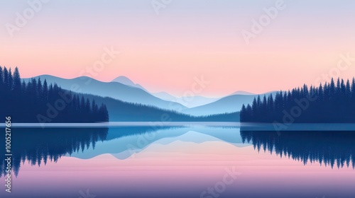 Fototapeta premium Peaceful Mountain Lake Sunset with Silhouettes of Pine Trees and Reflection -...