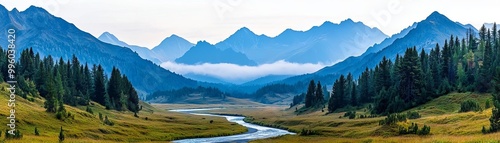 Fototapeta premium Peaceful mountain landscape with a flowing river winding through a lush valley