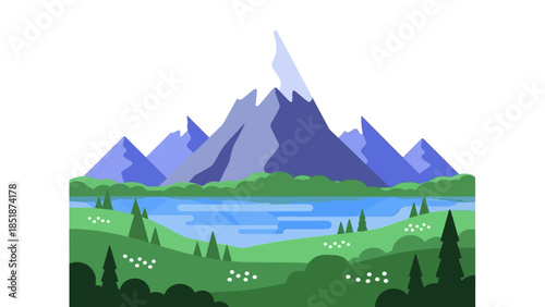 © Abhinaya Project, Naklejka premium Peaceful mountain landscape with a serene lake and lush green hills under a clear blue sky, evoking tranquility and natural beauty