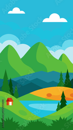 © amenagraphics, Obraz premium Peaceful mountain landscape with a small cabin by a lake and pine trees