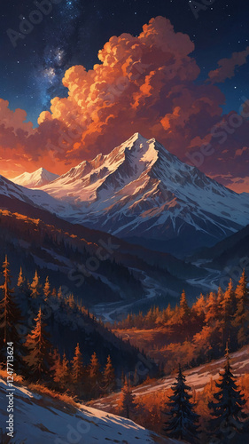© SecretCanvas, Obraz premium Peaceful Mountain Peak with Snowy Pine Forest Beneath a Red Dusk Sky with Clouds and Stars Twinkling Above Wallpaper Background Illustration Aesthetic