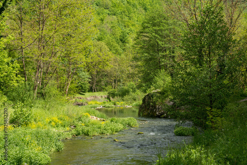 © Emilija, Fototapeta premium Peaceful mountain stream flowing through a lush green forest in spring