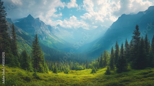 Obraz premium Peaceful Mountain Valley Panorama with Lush Greenery