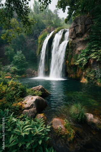 © Alexander Chaykin, Obraz premium Peaceful natural scene featuring a waterfall cascading into a pond surrounded by rocky cliffs and lush greenery, perfect for hiking or relaxation.
