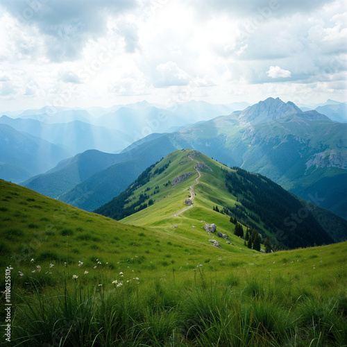 © Desinger, Fototapeta premium Peaceful Nature Scene with Green Hills and Cloudy Skies