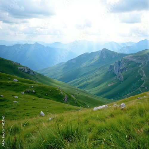 © Desinger, Fototapeta premium Peaceful Nature Scene with Green Hills and Cloudy Skies