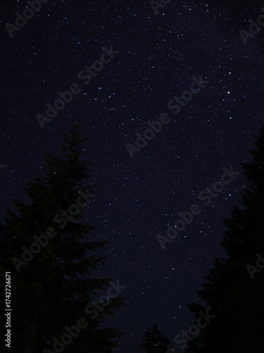© Denia, Naklejka premium Peaceful night in the mountains — campfire, tents and starry sky